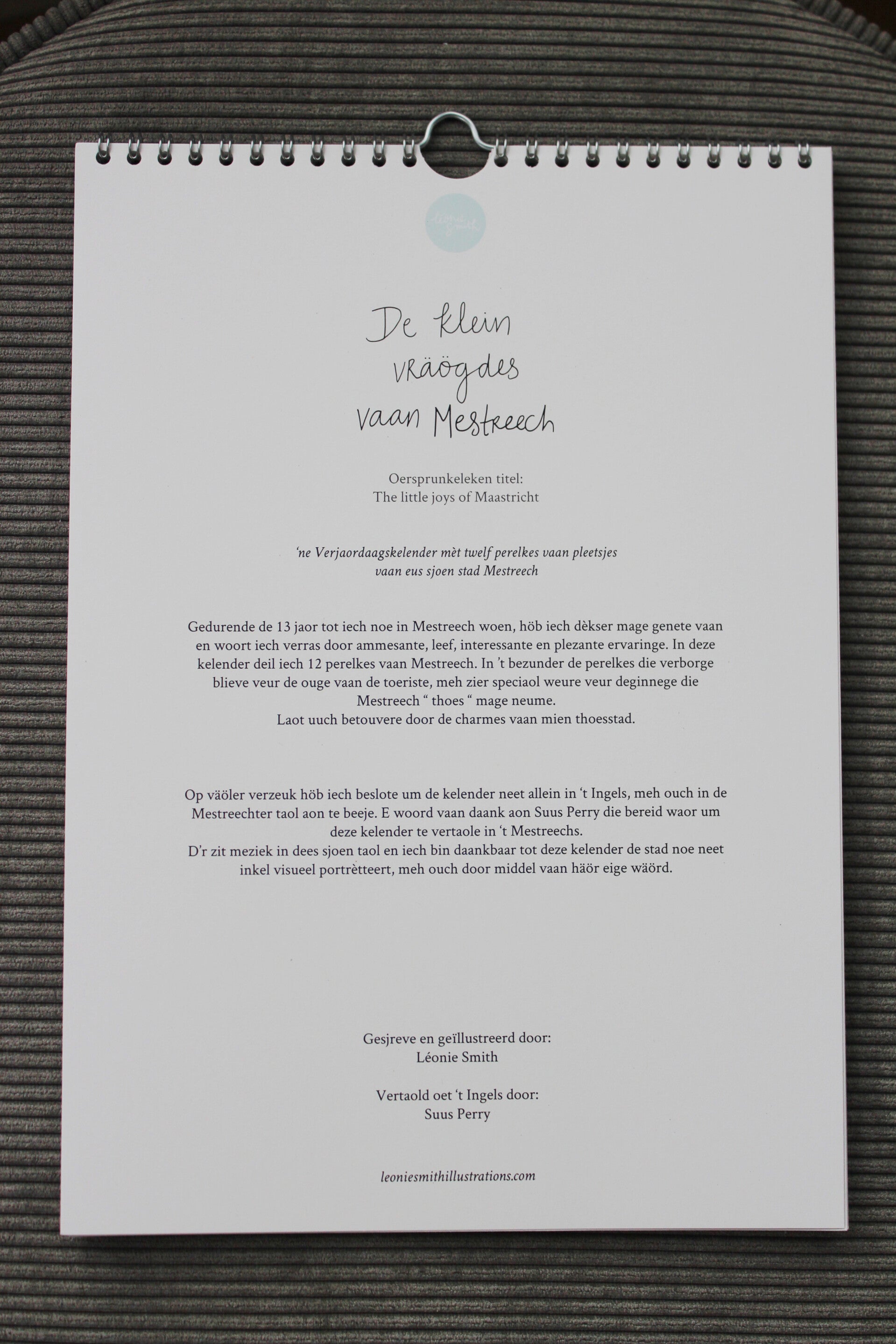 Wegens succesvolle verkoop van 'The little joys of Maastricht' kalender, is deze nu ook in het Mestreechs verkrijgbaar. Voor een overzicht van de illustraties, zie de portfolio pagina van het oorspronkelijke project in het Engels.
